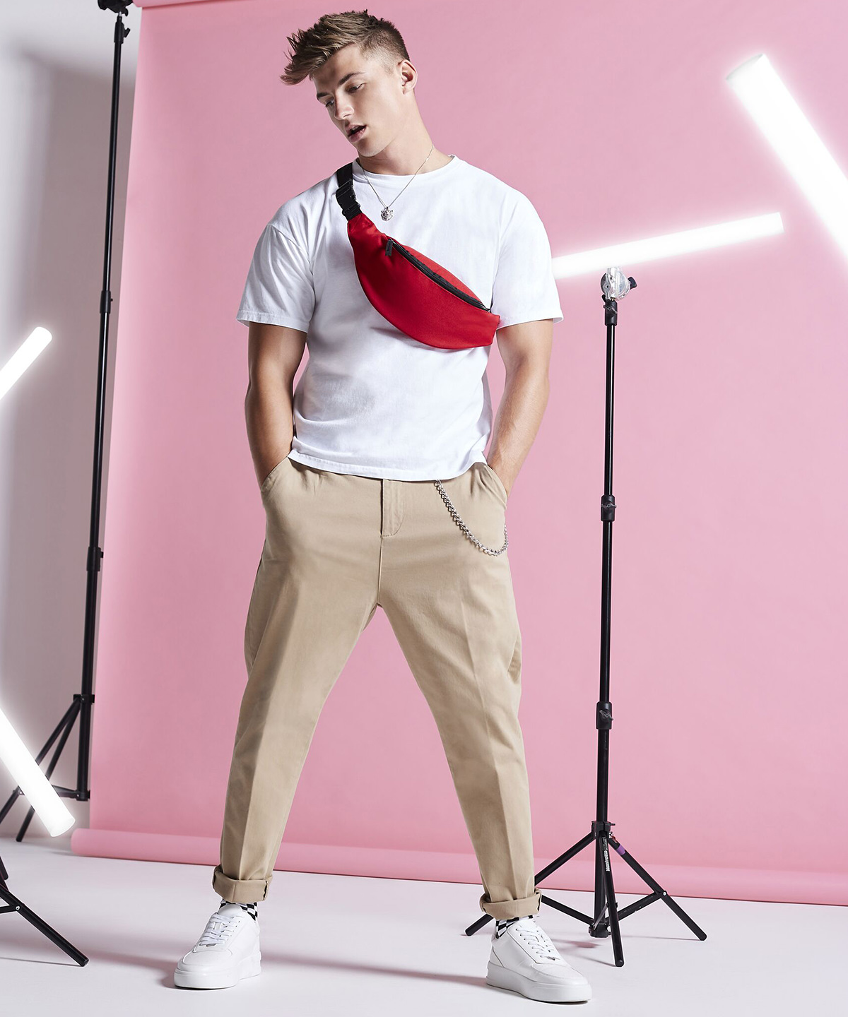 Adjustable webbing belt with secure clip fastener, large zippered main pocket, zippered rear pocket.