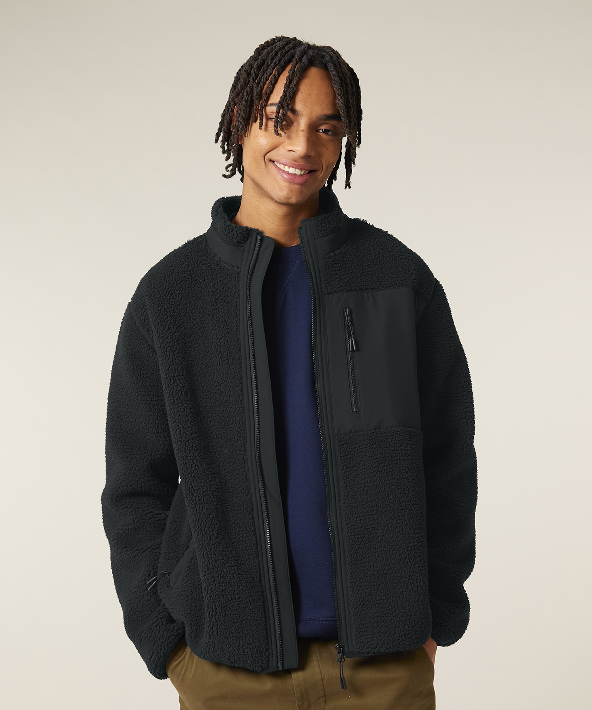 Premium unisex Sherpa jacket in 100% recycled polyester. Relaxed fit, 450gsm. Fully bonded inside fleece layer with an anti-pill finish. Contrast softshell inserts.