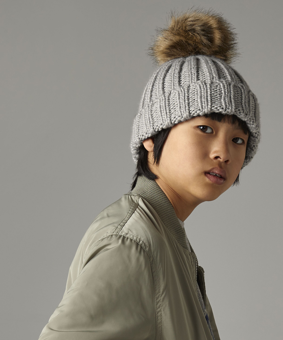 The mini-me trend continues to influence fashion with this fur pom pom chunky beanie. This season staple includes collectable colours that match and compliments the adult style. In a soft-spun acrylic fabric with a sumptuous ribbed knit feel, this cosy winter hat includes a luxe faux fur pom pom which is non-removable for added safety.