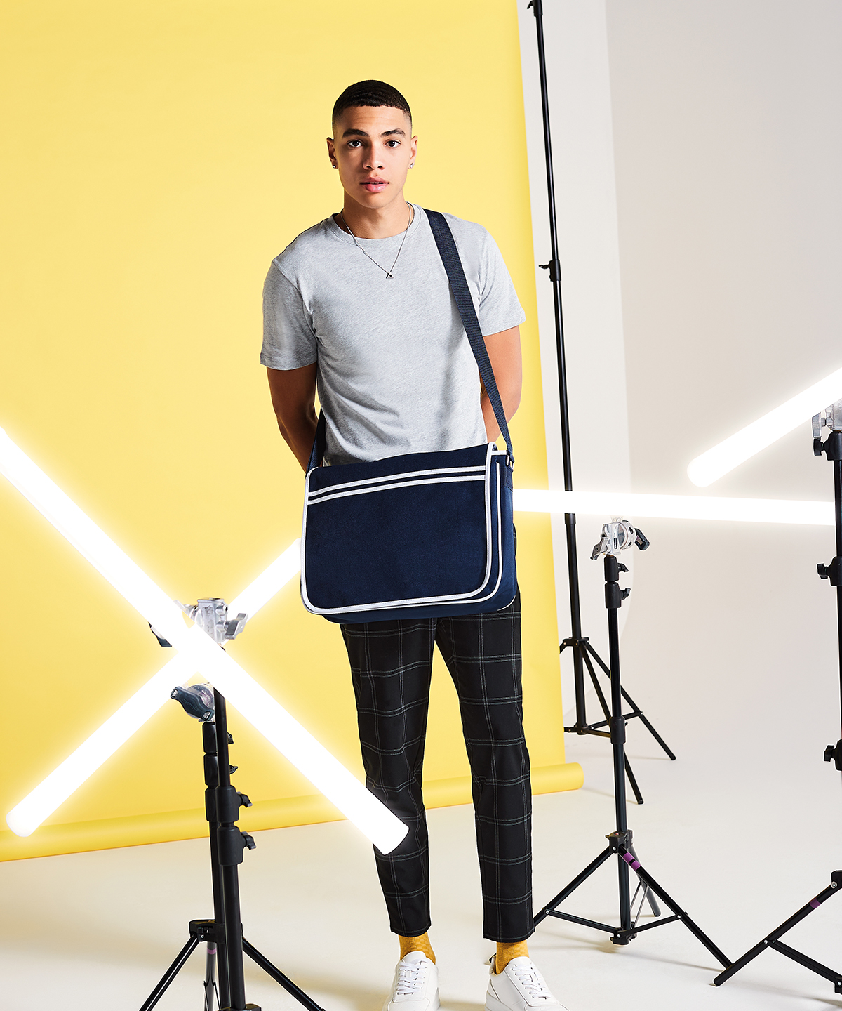 Retro styling. Adjustable shoulder strap. Zippered mesh pocket under flap. Rip-Strip™ closure. Contrast detailing. Reach certified.