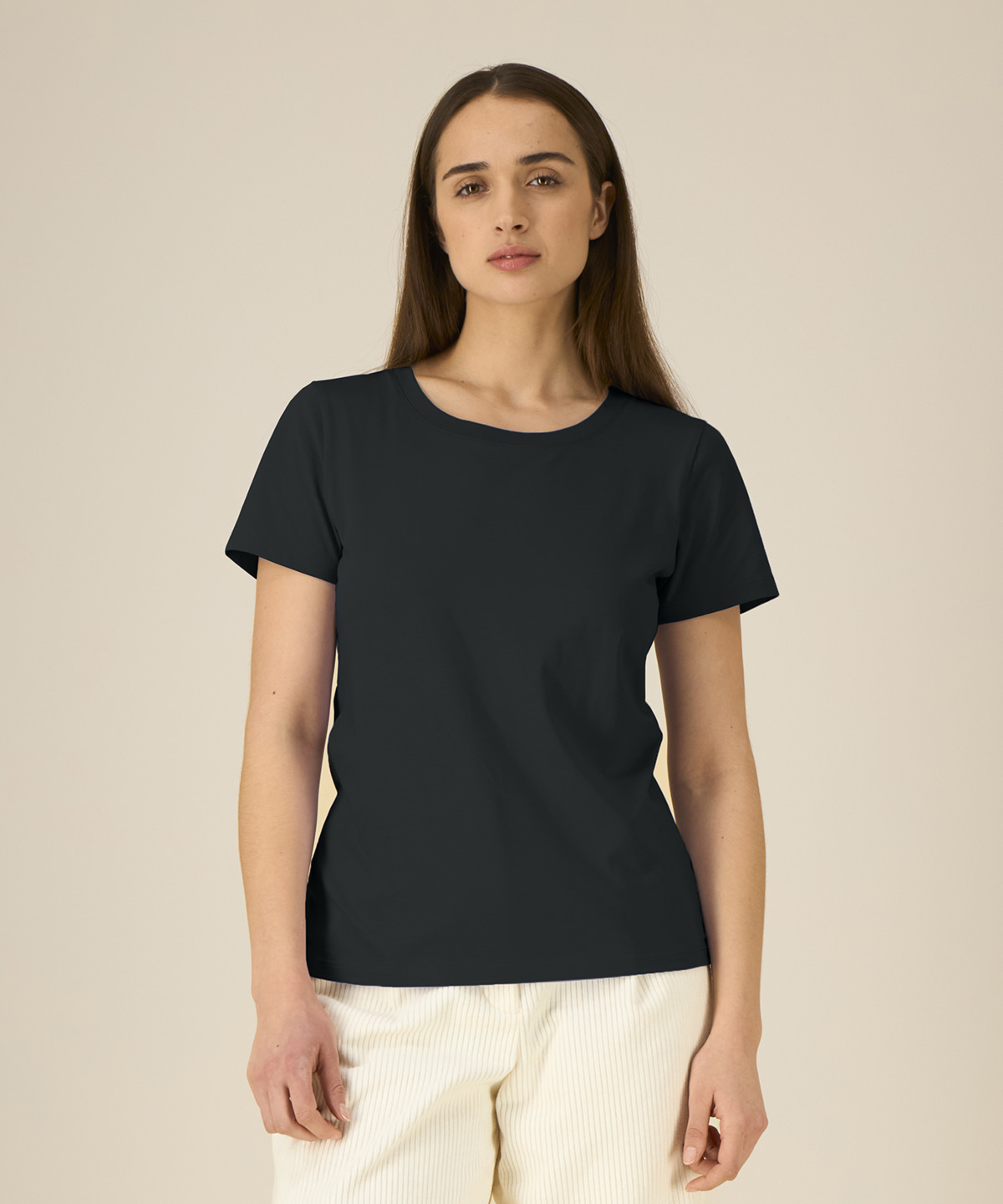 Iconic mid-light women’s t-shirt. Fitted. Set-in sleeve. 1×1 rib at neck collar. Inside back neck tape in self-fabric. Narrow twin-needle topstitch at sleeve cuff and hem.